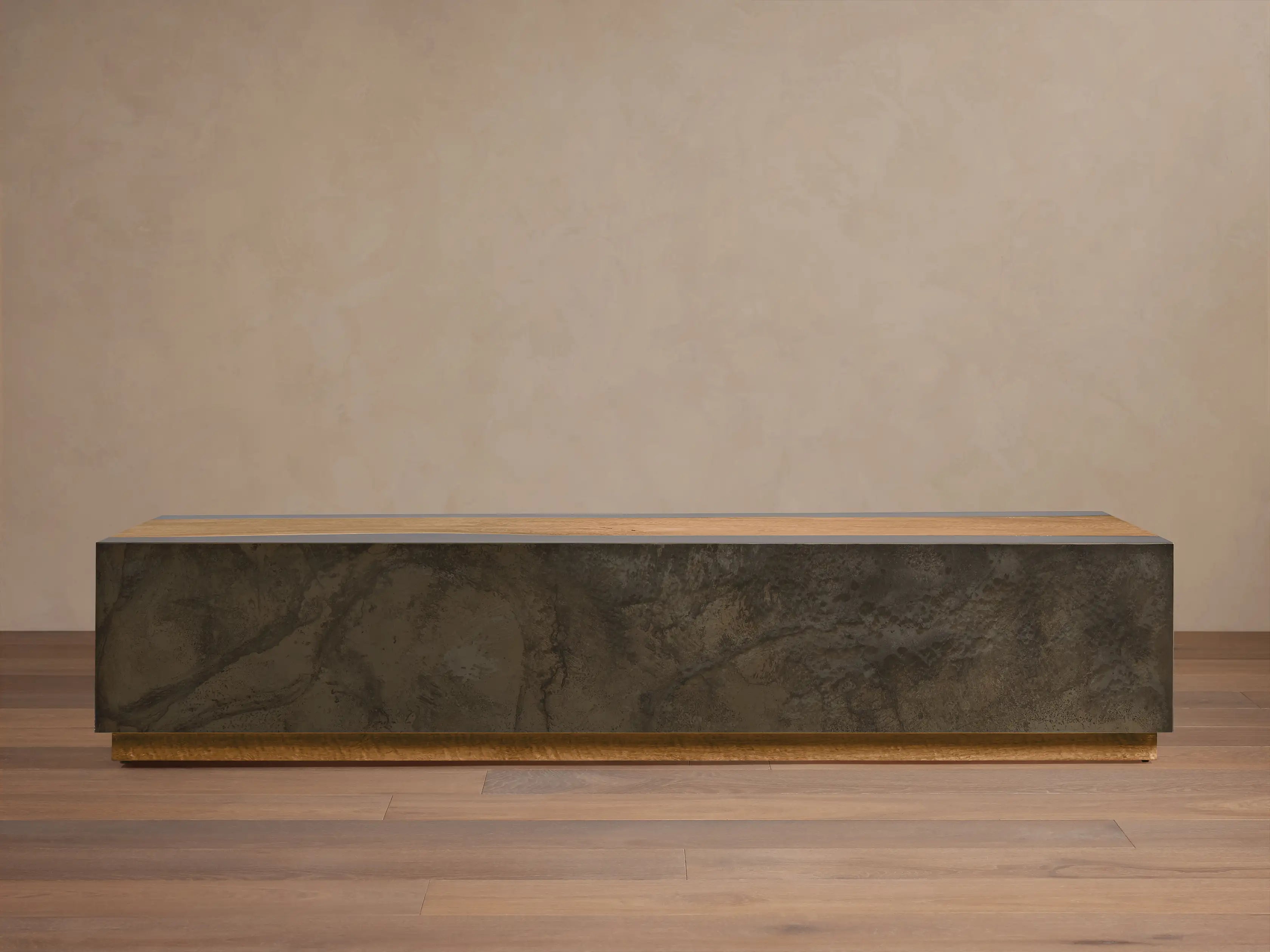 The Acacius Long Coffee Table is finished with a hand applied weathered coating and sealed with polyurethane to provide long lasting protection while preserving the natural texture and depth of the materials. The extended rectangular profile offers ample surface space while maintaining a sculptural and balanced look.
