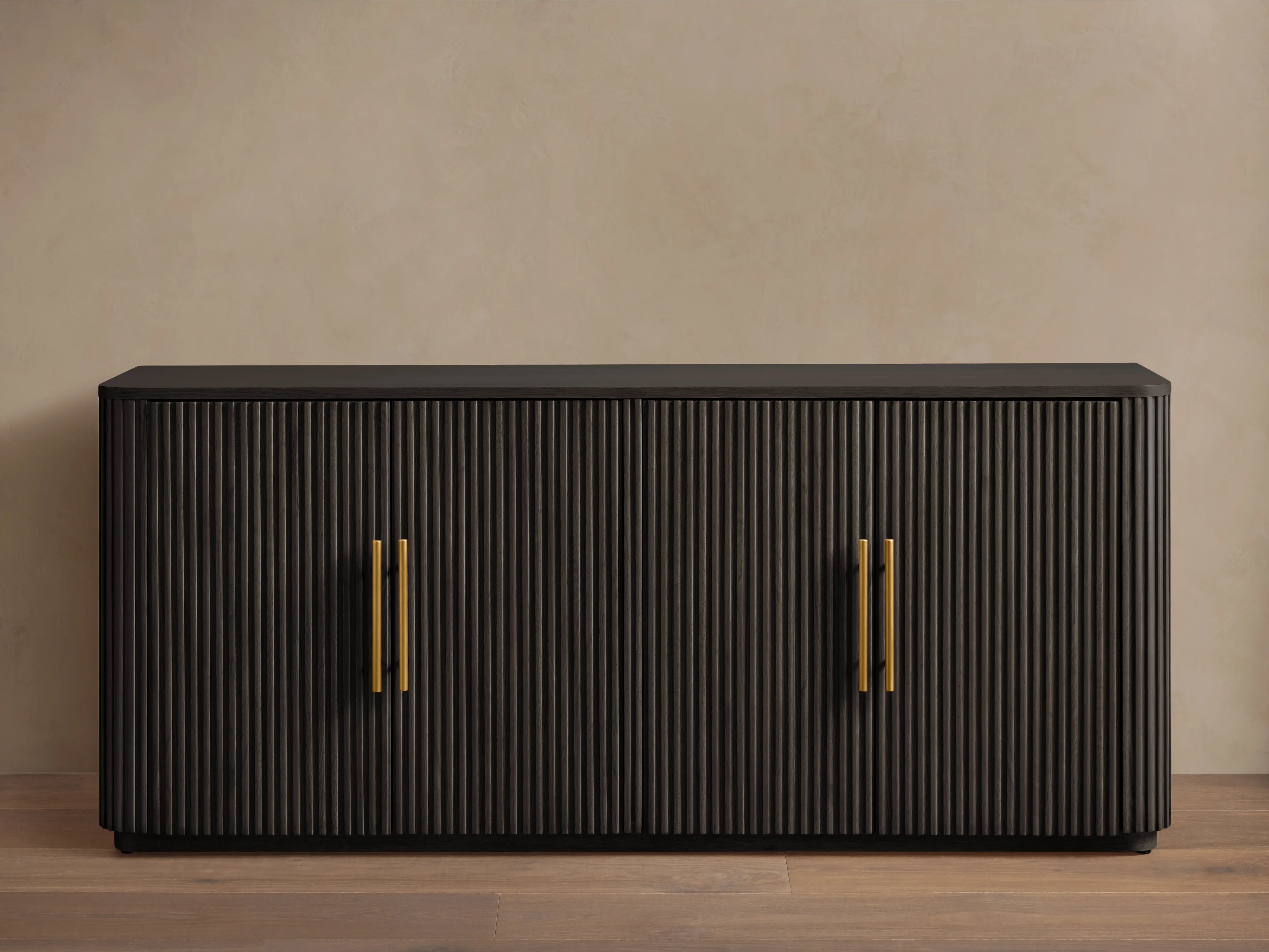 Built with reinforced mortise and tenon joinery, the Finnley Wood Sideboard delivers long lasting strength and stability. Zinc alloy hardware and a brass finished plinth base enhance the modern classic character, while hand stained wood surfaces are sealed with lacquer for a soft protective sheen.