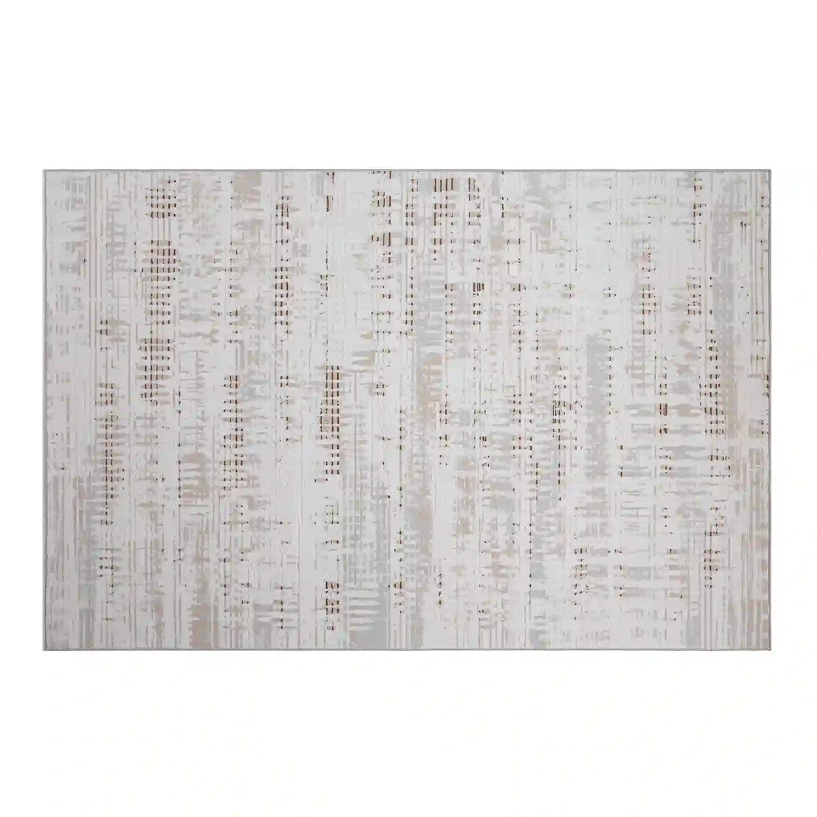 The Puxina rug features a refined abstract composition built from layered linear textures and softly broken grid motifs. Subtle shifts between ivory, warm beige, and muted gray create depth while maintaining a calm, orderly visual rhythm. The overall look is modern and restrained, making it a natural fit for living rooms, bedrooms, or workspaces that favor a balanced and composed atmosphere.