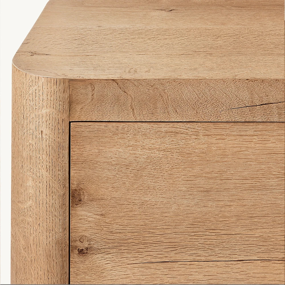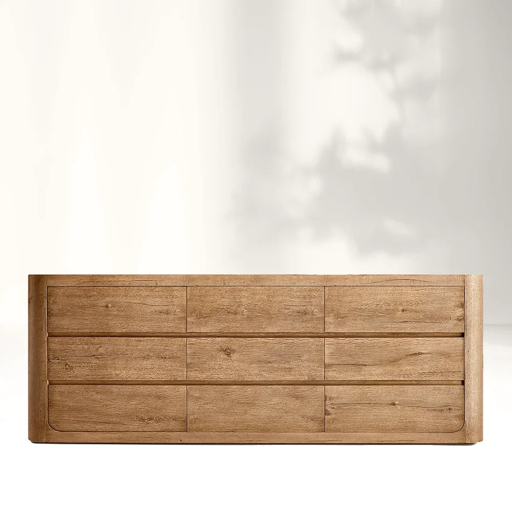 The Osla 9-Drawer Dresser, designed by Harrison and Nicholas Condos, reflects the essence of organic midcentury design through its clean lines and natural aesthetics. Crafted from American white oak, this dresser combines rustic textures with a minimalist approach, offering a unique blend of simplicity and sophistication.